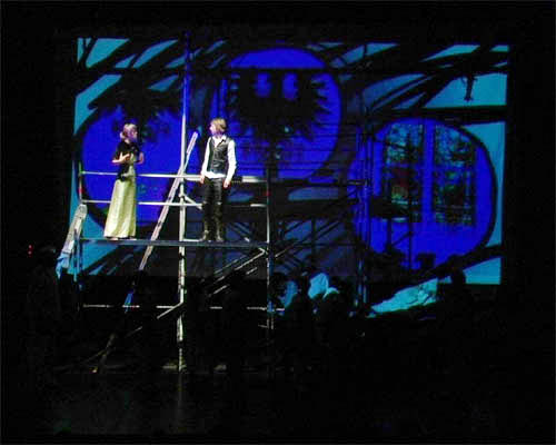BAUERNOPER 2006: Regie M.D.Lux Theatergruppe Vornerum Parktheater Bensheim (das Bühnenbild bestand aus der Animation von oben nach unten laufendener Symbole in drei Fenstern, nach dem Prinzip einer Slot-Machine, die dann in immer verschiedenen Anordnungenstehen blieben)